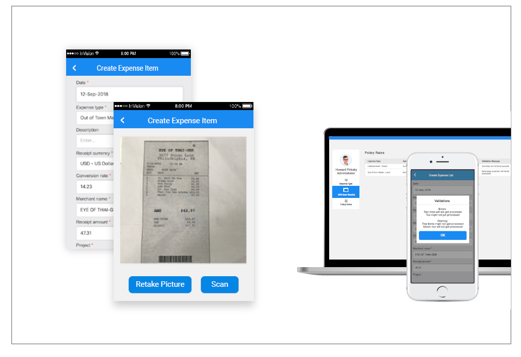Auto-create expense entries through OCR scanning – accurately read invoices and receipts by using a mobile camera.